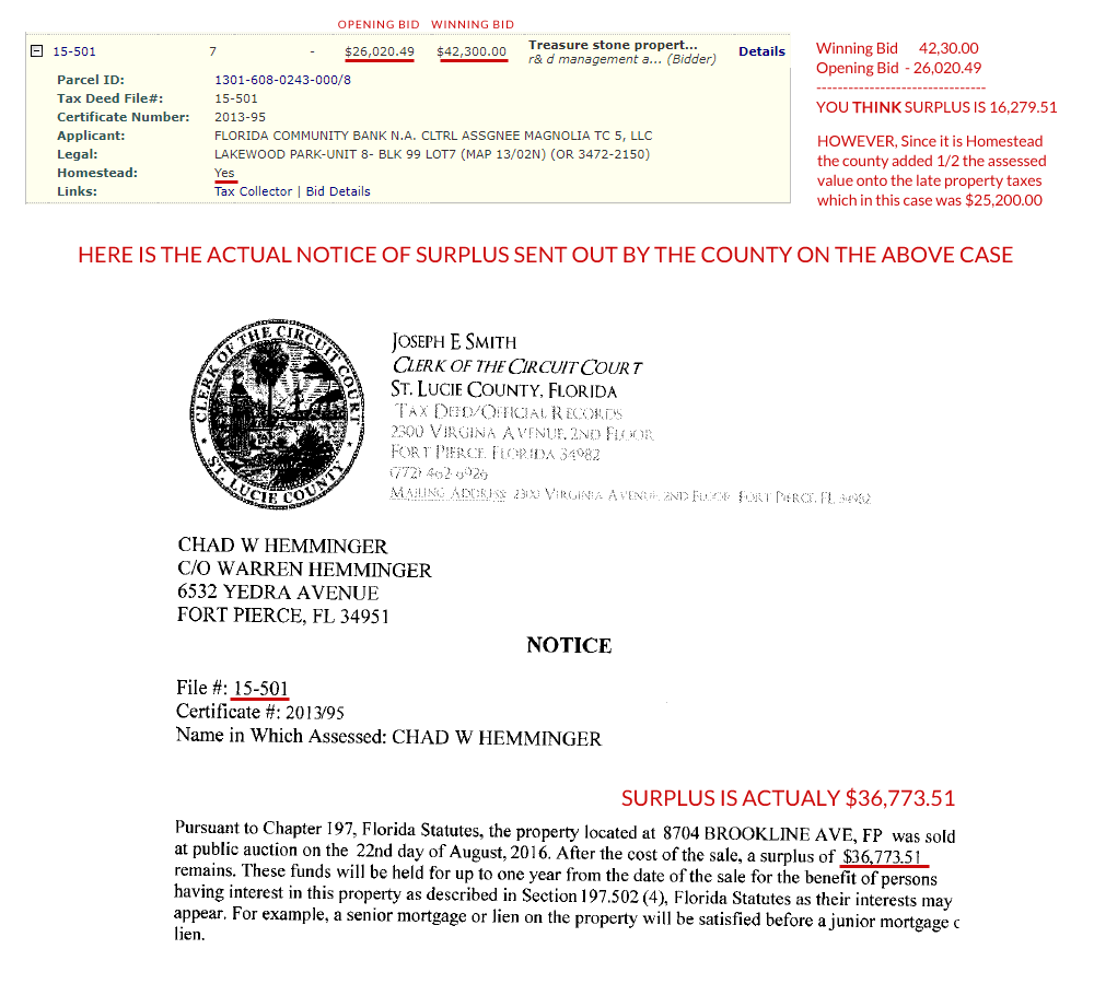 ^^ Just because you see something like “Starting Bid $50,000 and Ending bid $50,100” does not mean there is only $100 in surplus. If that property is homestead property, the opening bid includes half of the amount of the assessed value but that 1/2 IS included as part of the surplus amount.