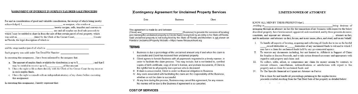 We have documents which discuss the Claim Process and the Routes you can take as well as samples of the Contingency Agreement, Power of Attorney and Assignment of Interest Forms