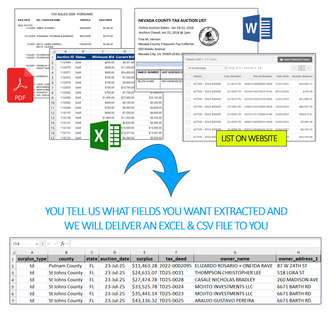 Surplus files come in all types: CSV, Word, Excel, PDF, a list on a web page, etc